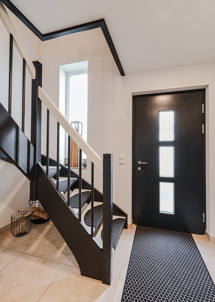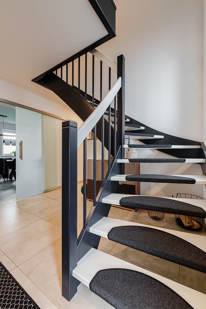 Eingestemmte Wangentreppe, mit einer 1/4 Wendlung, offen ohne Setzstufen, mit weißen Stufen und Handläufe.