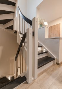 Wangen, Geländer u. Setzstufen weiß lackiert nach RAL, Stufen und Handläufe anthrazitgrau lackiert nach RAL.