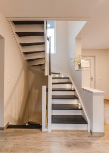 Moderne Wangentreppe, mit einer 1/2 Wendlung, geschlossen inkl. Setzstufen, Edelstahl Geländerstăben.