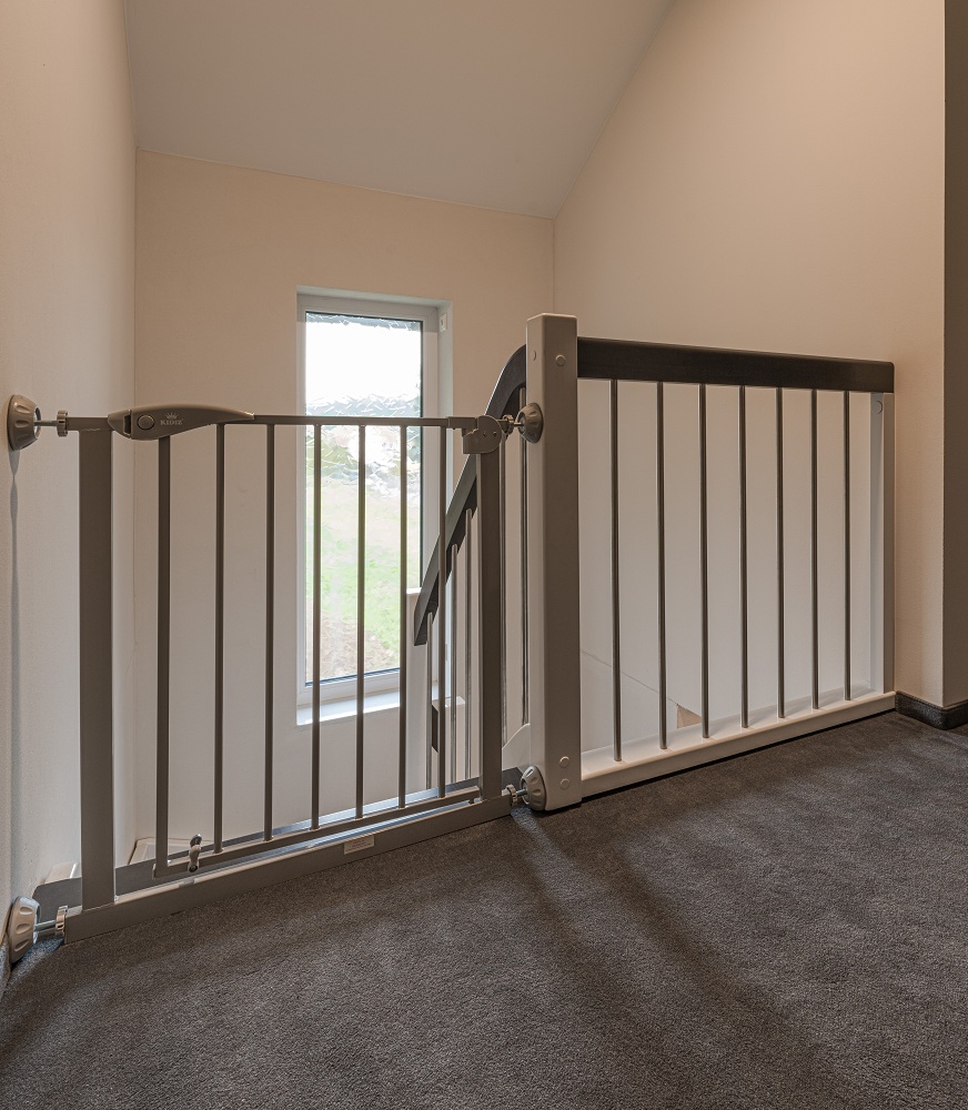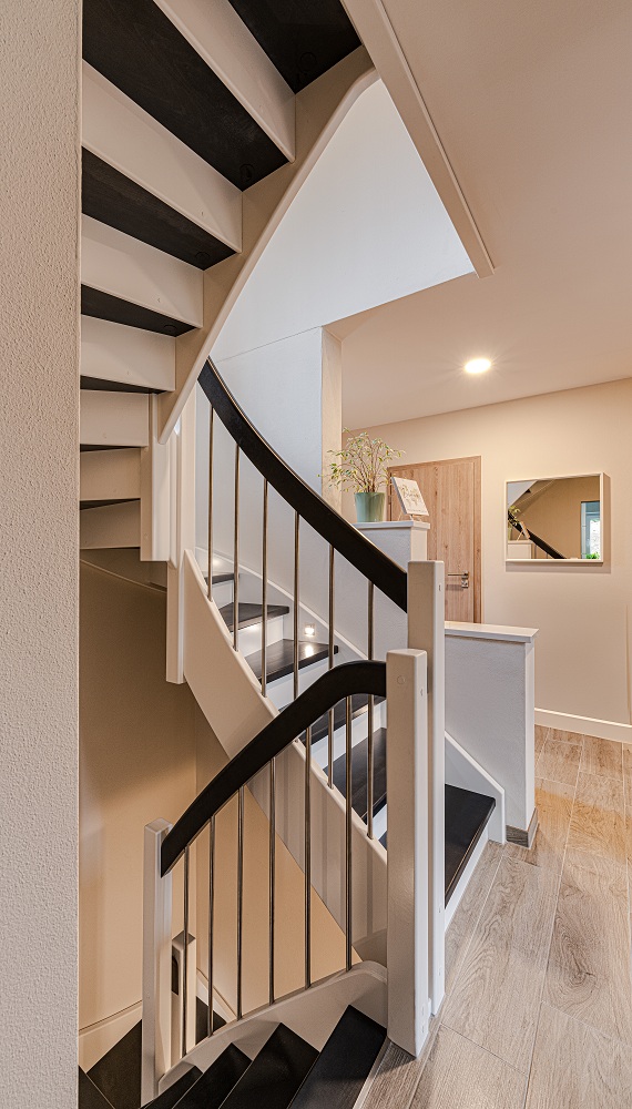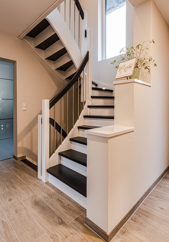 Wangen, Geländer u. Setzstufen weiß lackiert nach RAL, Stufen und Handläufe anthrazitgrau lackiert nach RAL.