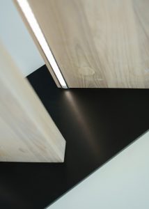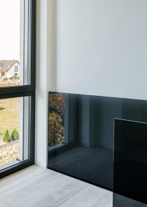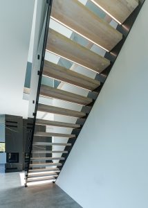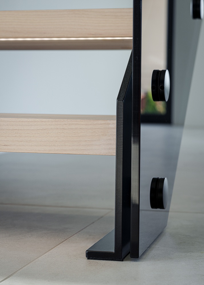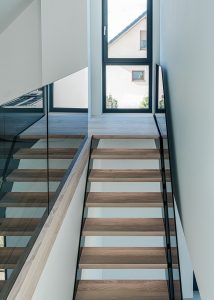 Stahlwangentreppe mit Glasgeländer und Holzstufen.