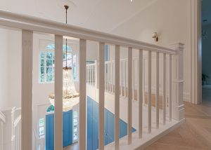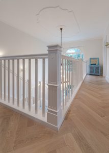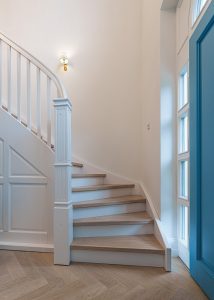 Stufen und Handläufe aus Eiche weiß geölt, inkl. Weißem Seitenverkleidung und einer Tür zum Keller.