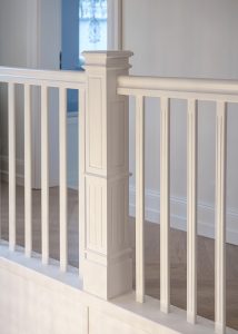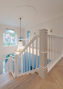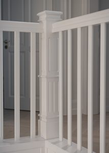 Klasiche geschglossene Wangentreppe mit weißen Geländer.