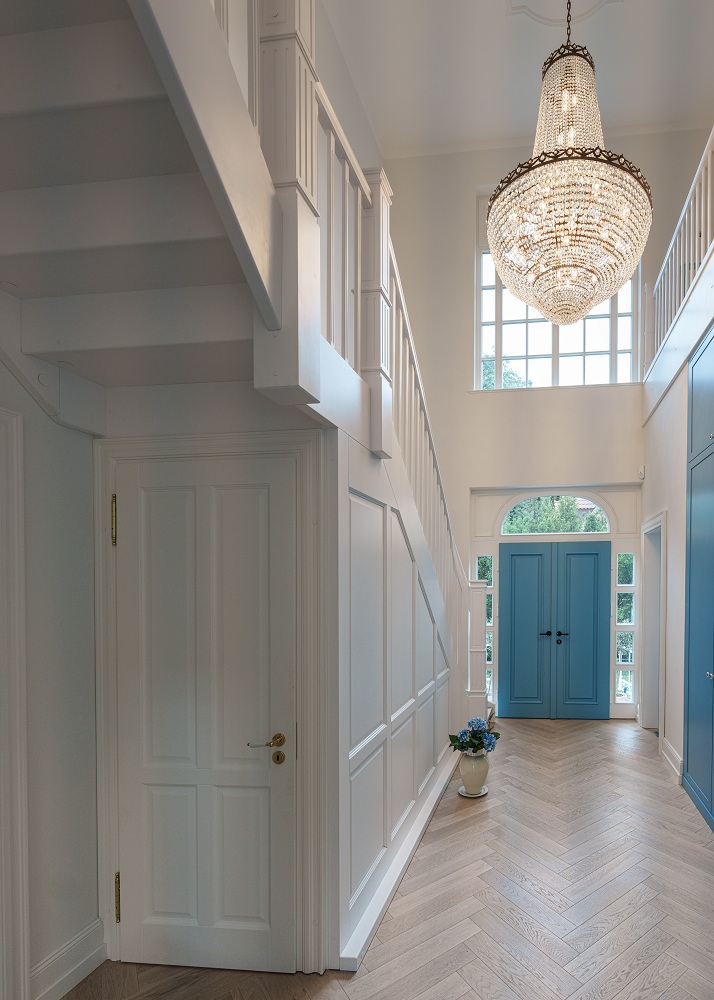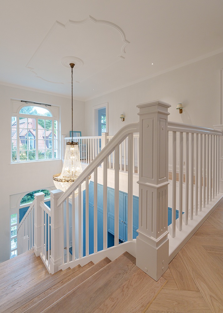 Stufen und Handläufe aus Eiche weiß geölt, inkl. Weißem Seitenverkleidung und einer Tür zum Keller.