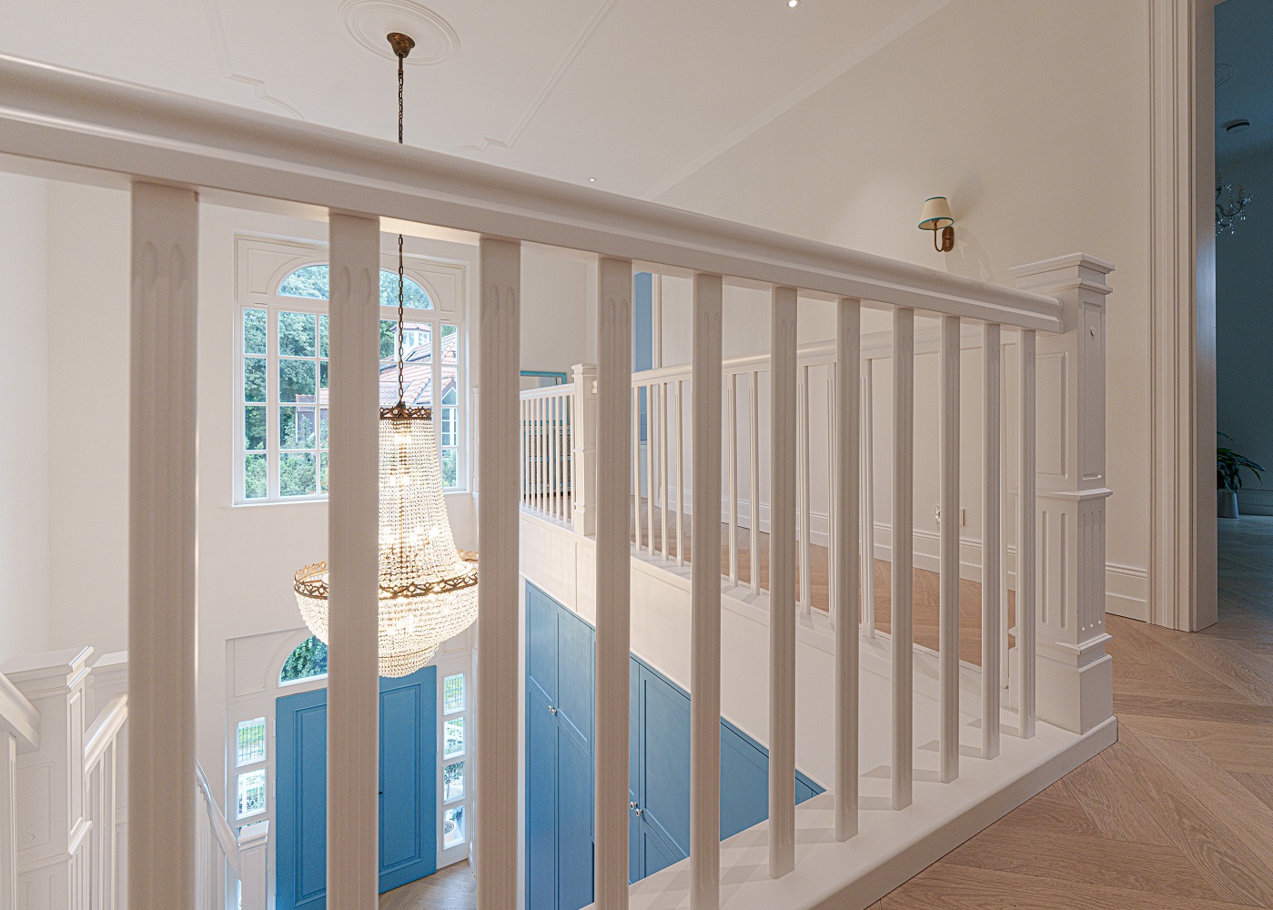 Klasiche geschglossene Wangentreppe mit weißen Geländer.